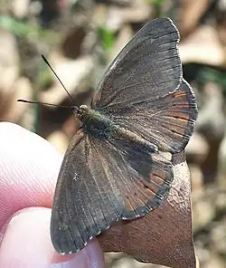 The wingspan of Boisduval's tree nymph is 40–45 mm.[2] The upper surface of the wings of the male are uniform dark brown, with small dark spots near the fringe of the hindwings. The female has an overall lighter brown colour on the upper surface, and orange-brown markings near the tips of the forewings. The dark spots near the fringe of the hindwings are more pronounced in females. The undersurface of the hindwings of both sexes are variegated grey and brown, and have an arc of seven dark spots encircled firstly by a greyish ring, and then an orange-brown ring. The undersurface of the forewing is orange brown with a row of four black spots near the tip. The female forewing also has two dark brown bands.
