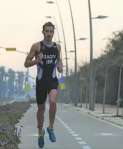 In October 2012, Sagiv won the gold medal in the 2012 Alanya European Triathlon Union (ETU) Junior European Cup in Alanya, Turkey, in the sprint triathlon competition (750-meter swim, 20-km bike, 5-km run) with a time of 53:31.[12][16] In June 2013, he won the silver medal in the 2013 Kupiskis ETU Triathlon Junior European Cup in Kupiskis, Lithuania, with a time of 57:30.[16] In November 2013, he won the silver medal in the 2013 Israel Triathlon National Championships with a time of 2:05:26.[16] In 2013 he was ranked 15th in the world for his age.[10]