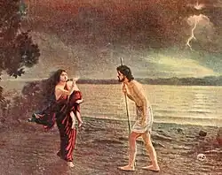 ![]() Shaivya bringing her son's corpse to the cremation ground; early 20th-century illustration | |