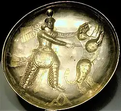 ![]() A depiction of a king killing a leopard on the "Klimova Plate" (Hermitage Museum), presumed to be Shapur III | |