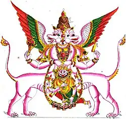 In Puranic literature, Sharabha is associated with the god Shiva and incarnates to subdue fierce manifestations of Vishnu. The legend of Sharabha fighting Narasimha - the man-lion form of Vishnu - brings to fore the overt rivalry between the devotees of Vishnu (Vaishnava sect) and those of Shiva (Shaiva sect), which exposes the fierce debate aspect.[1][8][9] The Shiva Purana describes Sharabha as lion-faced, with matted hair, wings and eight feet, and a thousand arms.[1][10] The Sharabha Upanishad portrays Sharabha with two heads, two wings, eight legs of the lion with sharp claws and a long tail.[11] The Kalika Purana describes Sharabha as black in colour, with four feet downwards and four feet uplifted, with an enormous body. It also has a long face and nose, nails, eight legs, eight tusks, a cluster of manes, and a long tail. It jumps high repeatedly making a loud cry.[9][12]