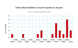 Five fatal shark attacks occurred in South Australian waters between the year 2001 and 2020. All fatal attacks have been attributed to great white sharks.[1]