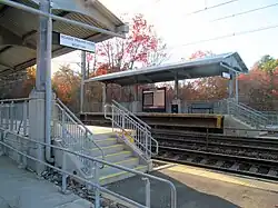 The project, which included adding mini-high platforms and improving handicapped access to the building, was originally expected to begin in the spring of 2013 and to be completed that fall at a cost of $1.2 million.[20] In May 2013, the MBTA issued a request for bids for the then-$2.6 million project, with work to start in August.[21][22] Notice to Proceed was given to the chosen contractor on September 5, 2013, with work to be completed by February 2014.[21] Noise testing begun in April 2014, followed by ongoing construction of mini-high platforms as well as improvements to the building and parking lot.[23] The accessible parking spots and the building retrofits were completed during May 2014.[1] The mini-high platforms were opened on September 30, 2014.[24]