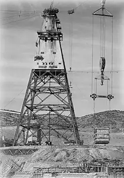 As the foundations were completed, concrete placement of the main dam body could begin. For this purpose, a system of steel cable towers was erected to carry the steel concrete-pouring buckets. The tower setup comprised one main tower, standing 465 feet (142 m) high from its foundations and 700 feet (210 m) above the river, and seven movable auxiliary towers; cables were strung from the top of the main tower to each of the others.[18] Using this system, construction crews were able to transport concrete from the mixing plant, which lay directly adjacent to the main tower at the end of the conveyor belt, to the rising structure of the dam faster and cheaper than any other method.[32][33] The tower was not fully demolished, so it remains submerged behind the dam. On occasion, the lake level can drop low enough to expose it again.[34]