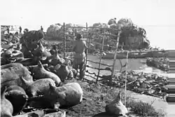 During the second world war, the Japanese army blocked the military supplies of the Chinese army along Jialing River. Lanzhou sheepskin raft chamber of commerce sent two skilled workers to the capital Chongqing with sheepskin rafts, which later carried military supplies and soldiers across the river.[4] Sheepskin rafts are considered an important contributor to the Sino-Japanese war and a symbol of Chinese patriotism.[5]