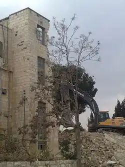 The Shepherd Hotel in Sheikh Jarrah was a villa built for the Grand Mufti of Jerusalem, Haj Amin al-Husseini, who never lived there and transferred property rights to his personal secretary, George Antonius and his wife, Katy Antonius.[37] After the death of George Antonius in 1942, his widow invited many of Jerusalem's elite to her house, though only one Jew. While living in the house, Katy Antonius had a highly publicized affair with the commander of the British forces in Palestine, Evelyn Barker. In 1947, the Jewish underground Irgun blew up a house nearby. Antonius left the house, and a regiment of Scottish Highlanders was stationed there.[37] After the 1948 war, it was taken over by the Jordanian authorities and turned into a pilgrim hotel. In 1985, it was bought by the American Jewish millionaire Irving Moskowitz and continued to operate as a hotel, renamed the Shefer Hotel. The Israeli border police used it as base for several years.[37] In 2007, when Moskowitz initiated plans to build 122 apartments on the site of the hotel, the work was condemned by the British government.[38] In 2009 the plan was modified, but was still condemned by the U.S. and UK governments,[39] Permission to build 20 apartments near the hotel was given in 2009, and formal approval was announced by the Jerusalem municipality on March 23, 2010, hours before Prime Minister Benjamin Netanyahu met with President Barack Obama.[40] Haaretz reported that, "an existing structure in the area will be torn down to make room for the housing units, while the historic Shepherd Hotel will remain intact. A three-story parking structure and an access road will also be constructed on site."[41] The hotel was finally demolished on January 9, 2011.[42]