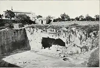 The neighborhood Sheikh Jarrah was established on the slopes of Mount Scopus, taking its name from the tomb of Sheikh Jarrah.[10] The initial residential construction works were commenced in 1865 by an important city notable, Rabah al-Husayni, who constructed a large manor among the olive groves near the Sheikh Jarrah tomb and outside the Damascus Gate. This action motivated many other Muslim notables from the Old City to migrate to the area and construct new homes,[11] including the Nashashibis, built homes in the upscale northern and eastern parts of the neighborhood. Sheikh Jarrah began to grow as a Muslim nucleus between the 1870s and 1890s.[9] Prayer at the Sheikh Jarrah tomb is said to bring good luck, particularly for those who raise chickens and eggs.[12] It became the first Arab Muslim-majority neighborhood in Jerusalem to be built outside the walls of the Old City. In the western part, houses were smaller and more scattered.[9]