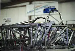 A Shelby Can Am tube frame chassis on the surface plate at Racefab Inc.
