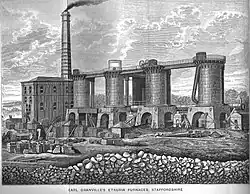 The main site began around 1830, was rapidly developed in the 1840s by the 4th Earl Granville[1] and his managing partner William Roden MP. In 1873 there were 93 puddling furnaces, 7 mills and 8 blast furnaces with extensive iron mines and collieries.[2] Many coal mines were sunk on the site, and railways built into the site which stretched from the western reaches of Hanley into Etruria as far as Middleport. In 1920 the company was acquired by John Summers & Sons,[3] who developed the site into an efficient modern steelworks. During World War II it was a frequent target for German bombers as it was impossible to fully blackout the light from the huge blast furnaces. Shelton Bar came under nationalised ownership in 1951, only to be denationalised by the Conservative government in 1953. The works was re-nationalised again in 1967 by the Labour Party and the main works was closed in 1978, after which the eastern 200 acres (0.81 km2) of the site was reclaimed for the 1986 National Garden Festival site, the Stoke-on-Trent Garden Festival.