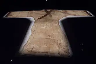 Moreover, the shenyi in this period, regardless of its cut, could also be padded, lined, or unlined.[11] More examples of unearthed archeological artefacts of shenyi made of diverse cuts and materials from the Mawangdui tomb can be found in Museums, such as the zhíjūsùshādānyī (直裾素纱襌衣; 'straight plain gauze unlined robe'), the qujusushadanyi (曲裾素纱褝衣; 'curved plain gauze unlined robe'),[14] and simianqujupao (丝绵曲裾袍; 'silk cotton qujupao'),[29] found in the Hunan Museum. According to the Western Han dynasty-era Fangyan by Yang Xiong, the danyi (襌衣; 'unlined clothing')—also called die (褋), zuoyi (袏衣), and chengyi (裎衣) depending on its geographical location—was called shenyi in ancient times.[30]