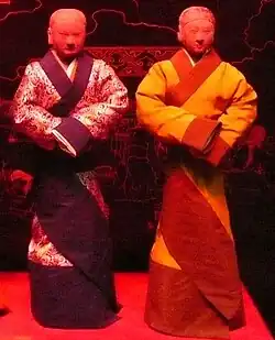 By the Western Han dynasty, the shape of the shenyi had deviated from the earlier versions as it can be found in the Mawangdui tomb of the same period belonging to Lady Dai.[11] The shenyi had evolved into two types of robe: the qujupao (曲裾袍; 'curved robe'; "curved gown"), and the zhijupao (直裾袍; 'straight robe').[1]: 13–14 These two robes differed from each other based on their front opening and the way their lapels overlapped: the qujupao would curve and wraps the dress to the back while the front opening of the zhijupao would fall straight down.[11] The qujupao directly evolved from the wrapping-style shenyi which was worn in the pre-Qin period and became popular in the Han dynasty.[18]: 32