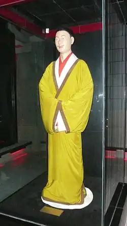 The shenyi is a long one-piece robe, unlike the Ru–Qun/Ku attire that was more popular among aristocrats and scholar-officials prior to the Qin dynasty, where the upper and lower garments are separate pieces.[3] The shenyi, along with its components,[4] existed prior to the Zhou dynasty[5][6] and appeared at least since the Shang dynasty,[3] but was developed into a complete system of attire during Zhou dynasty, being shaped by the strict Zhou feudal hierarchical system in terms of social levels, gender, age, and situation and was used as a basic form of clothing.[3] It then became the mainstream clothing choice during the Qin and Han dynasties,[3] by the latter of which it had evolved into two styles: the qujupao (曲裾袍), characterized by helical plackets; and the zhijupao (直裾袍), characterized by straight plackets.[1]: 13–14 The shenyi later gradually declined in popularity around the Wei, Jin, and Northern and Southern dynasties period.[3] However, its influence persisted among the commoners in the following Sui and Tang dynasties,[3] during which the round collar robes such as yuanlingshan and chest-high skirts were more popular within the high society. The shenyi regained popularity as a form of formal wear for educated elites during the Song and Ming dynasties[7] with advocation from famous scholars such as Song dynasty's Zhu Xi in his Zhuzi jiali (朱子家禮),[8] and Ming dynasty's Huang Zongxi, as well as Jiang Yong in the Qing dynasty.[3]