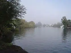 The village includes the neighbourhood of Lower Halliford, formerly a near but separate hamlet, which historian Susan Reynolds places at the eastern end of a reduced, river bend-consumed half of the early medieval village, east of the Old Shepperton Conservation Area due to erosion.[19][38]