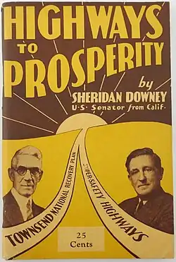 After Sinclair's defeat, Downey became an attorney involved with Dr. Francis Townsend, the main advocate of the Townsend Plan for government old-age pensions.[5] Townsend's $200-a-month pension plan had won a large following in California, particularly among retirees. Downey's support lead to him writing Why I Believe in the Townsend Plan (1936).[2] In 1936, the two drifted apart, as Townsend supported Union Party presidential nominee William Lemke of North Dakota, and Downey remained a Democrat committed to Franklin Delano Roosevelt.