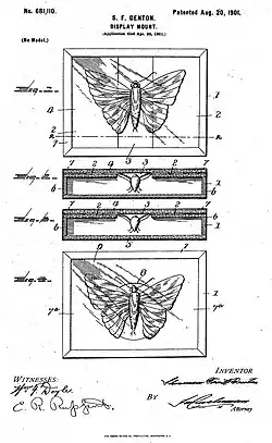 Sherman invented and patented, in 1901, the mounting of lepidopteran specimens on a white plaster tablet under glass instead of the traditional pinning. Along with his brother, he sold numerous mounted specimens made by the Denton Brothers Company in Wellesley. He also produced numerous butterfly scale prints (also called lepidochromes).[6] The two volume book As Nature Shows Them (1900) produced in a limited 500 copies made use of actual butterfly and moth wing transfers for the colored plates, with the body and legs hand-painted.[7] Denton also took an interest in pearls, made a large collection of freshwater pearls, and published a book on pearls in 1916. His brother Shelley worked as a curator of the bird collections at Cambridge, Massachusetts around 1887 and catalogued the collections of William Brewster (1851–1919).[8]