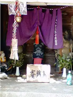 After Shibaemon's death, the people who came to see Nakaza decreased and there was a rumor that "it was a curse from having killed Shibaemon," so when the theater deified Shibaemon, the number of guests returned.[5] Afterwards, Shibaemon, as a popular god, was deeply worshipped by many actors such as Nakamura Ganjirou, Kataoka Nizaemon and Fujiyama Kanbi.[5] Afterwards, in what was called Shibaemon's return home, the Shrine of Shibaemon was built in Sumoto due to Nizaemon, Kanbi and others's donations.[5][6] Now, the Shrine of Shibaemon is near the castle ruins of Sumoto at the peak of Mt. Mikuma and due to the legend of Shibaemon, who liked theater, there are many performers who visit the shrine even now.[7] The Shibaemon Daimyoujin (柴右衛門大明神) that was deified in Nakaza also had a "return home" in the year 2000 and is now deified in the Sumoto Hachiman-jinja.[8][9]