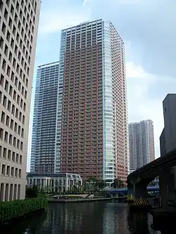 Shibaura (芝浦) is a district of Minato ward located in Tokyo, Japan. The district is located between the eastern side of the Yamanote Line train and Tokyo Bay. Shibaura consists mostly of artificial islands created by the excavation of industrial canals in the early 20th century. Formerly a light industrial area, it became famous for its night life during the Japanese asset price bubble period and, since the early 2000s, has become a high-rise residential district.