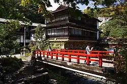 Shima Onsen is one of the oldest and most popular onsens in Japan. There are over 40 separate hot spring sources available in many ryokans and public bath houses. The town of Shima Onsen is located in the Shima river valley and is divided to 3 parts. The Japanese name means "40 thousand" indicating that the baths cure many diseases.[2][3] Some of the hot springs facilities add salt to the mineral rich spring water.[4]