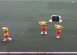 Named Palchan and sporting big, winglike ears, S-Pulse's mascot supports the team and entertains fans by performing choreographed, and often acrobatic, dance routines during the buildup to home games. He often performs with the help of his two younger siblings.[48] Designed by professional cartoonist Guy Gilchrist, Palchan's name is taken from the English pal and the pul of S-Pulse.[49] The suffix chan is an affectionate title commonly used in Japan. Sporting team number zero, Palchan goods are a consistent best seller with various merchandise available. S-Pulse also have a cheer leading team named Orange Wave. The team perform routines prior to kick off and half time as well as making various appearances at S-Pulse themed events in and around Shizuoka.[50]