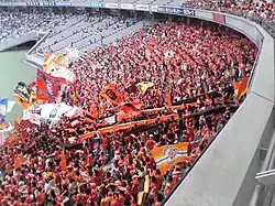In common with other J.League teams, S-Pulse have a colourful and noisy collection of supporters who follow the team around the country. A supporter band is present at games home and away to help galvanise support and raise the decibel levels. The band models itself to a large degree after its Brazilian counterparts, and Latin rhythms and samba sounds predominate. For home games, S-Pulse's more vocal supporters gather in the second tier of The Kop; the stand behind the west goal at Nihondaira Stadium.[19] Also in this area can be found S-Pulse's various organised supporter groups. These groups include fan clubs dedicated to specific players and are often identifiable by unique uniforms. These fan clubs work to organise events which include mass choreographed displays and the supporter band.[20] Also housed in The Kop are S-Pulse's band of ultras, who each game take over a central area behind the goal which has been dubbed The Dragon Zone. Often physical, it is not uncommon for the area to descend into a mosh pit after important goals, and signs posted around the stand inform and caution general supporters of the area's lively nature. The club's official fan club has several branches around the country, and S-Pulse supporters are officially listed as the team's twelfth player.