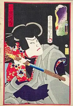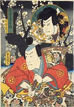 Shimizu no kanja Yoshitaka was a samurai warrior from the late Heian period of Japan.[1] The eldest son of Yoshinaka of Kiso, Minamoto clan.[1][2] In his eleventh year, he was sent to Minamoto no Yoritomo as a hostage in order to avoid the conflict between his father and Yoritomo.[1][2][3] According to traditions, Yoshitaka fell in love with Ōhime, the eldest daughter of Yoritomo.[4] Later years, as a result of the discord between Yoshinaka and Yoritomo, the latter defeated the former.[1] Three month later from the killing of his father, Yoshitaka fled, but captured and executed at a riverbed of Iruma River.[5] In later years, many works featuring Yoshitaka were made, including A Tale of Kiso Yoshitaka (or Shimizu no kanja) in Otogi-zōshi, Raigōajarikaisoden by Takizawa Bakin, and some Noh songs.[1] Yoshitaka has been said to be handsome.[6]
