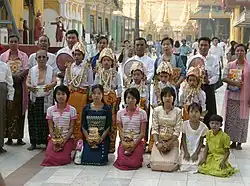 Shinbyu is considered one of the Twelve Auspicious Rites in Burmese culture. It is deemed the most important duty that parents owe to their son by letting him go forth and embrace the legacy of Gautama Buddha, join the sangha and become immersed in the teachings of the Buddha, the Dhamma, at least for a short while, perhaps longer if not for the rest of his life. A boy may become a novice on more than one occasion, but by the age of twenty there will be another great occasion, the upasampada ordination, in which the boy becomes a fully ordained bhikkhu (ပဉ္စင်း bazin).[1] Those who are not blessed with a male child will seek for an orphan boy or a boy from very poor families in order to receive this special dispensation by the Buddha and hence gain great merit by the act. Shinbyu may well be regarded as a rite of passage or coming of age ceremony as in other religions. Allowing a son to spend some time however short it may be, in a kyaung (Burmese Buddhist monastery) is regarded by most Burmese Buddhists as the best religious gift that his parents can give him and it is believed to have a lasting effect on his life.