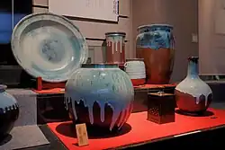 Shiraiwa ware (白岩焼 Shiraiwa-yaki) refers to a type of Japanese pottery that is produced in Shiraiwa, Kakunodate, Akita Prefecture, Japan.[1][2] The tradition began in the 1770s and faded out during the last decade of the 19th century.[3] It was revived, however, during the 1970s and 1980s by a descendant of one of the original Shiraiwa potters and her husband.[4] Their kiln, Wahee-gama, is the only one producing Shiraiwa ware today. Shiraiwa ware is especially known for its characteristic blue glaze. A large blue Shiraiwa ware vase made at Wahee-gama was featured in the 2016 film Godzilla Resurgence.[5]
