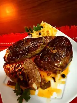 Shirdan, also spelled şırdan, shirden, شیردان or Ширден is an offal dish consumed in Western Asia. It is prepared by washing the abomasum (lower stomach) of a sheep and then stuffing it with chopped meat, onions, and paprika, then further seasoning it with black pepper, pimento and salt. Water is then added and the opened cavity is sewn with a needle and thread. Lastly, it is baked with animal fat in an earthen casserole.