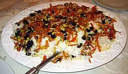 Shirin polo, also commonly known as Persian wedding rice or Rosh Hashanah rice, is a traditional Persian rice pilaf that is commonly served to mark special occasions such as weddings.[1] It is a simplified version of morassa' polō, lit. 'jeweled rice'.[2][3]