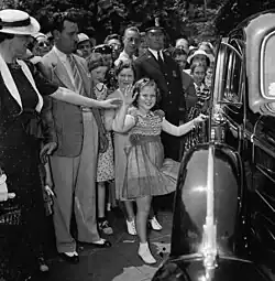 As her contract with 20th Century-Fox was coming to a close, Temple's mother applied her for entrance into the Westlake School for Girls in September 1939.[48] There, Temple would enroll as a seventh-grader. Temple noted that she had difficulty adapting to a school environment after having spent much of her youth with adults and private tutors. However, her classmate June Lockhart described her as having "integrated herself right away" and seeming "delighted to be there". Temple frequently attended school dances and extracurricular activities, and according to Lockhart, "students did not treat her differently despite her successful film career."[49][50] Temple graduated from the school in May 1945.[51][52]