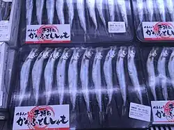 The total 2021 catch in Kushiro, where 85% of Japanese shishamo are caught, was 124 tons - a reduction of 50% compared to the year before. Due to declining catches in recent years, attempts have been made to commercially farm the fish in Japan.[5] In recent years capelin (Mallotus villosus) has appeared on the market with the name "Karafuto shishamo." Approximately 20,000 tons are imported to Japan annually.[6]