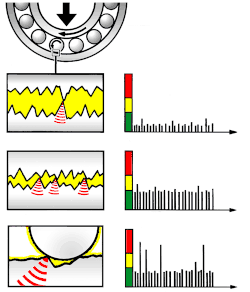 The filtered transducer signal reflects the pressure variation in the rolling interface of the bearing. When the oil film in the bearing is thick, the shock pulse level is low, without distinctive peaks. The level increases when the oil film is reduced, but there are still no distinctive peaks. Damage causes strong pulses at irregular intervals.