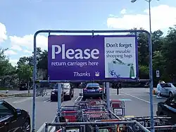 Electronic systems are sometimes used by retailers. Each shopping cart is fitted with an electronic locking wheel clamp, or "boot".[39] A transmitter with a thin wire is placed around the perimeter of the parking lot, and the boot locks when the cart leaves the designated area. Store personnel must then deactivate the lock with a handheld remote control to return the cart to stock. Often, a line is painted in front of the broadcast range to warn customers that their cart will stop when rolled past the line. However, these systems are very expensive to install and although helpful, are not foolproof. The wheels can be lifted over the electronic barrier and/or pushed hard enough that the locks break.[37][40] There are also safety concerns if the person pushing the trolley is running, and also if the trolley doesn't lock and is taken onto a road, locking due to magnetic materials under the road. Some cities have required retailers to install locking wheel systems on their shopping carts. In some cases, electronic systems companies have encouraged passage of such laws to create a captive audience of potential customers.[41]