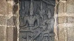 The smaller Shiva temple behind the main temple is a double storied structure with a stepped pyramidal tower with an octagonal shikhara built over a circular griva. A kalasa and finial are fitted above the shikhara. kudus (horseshoe-arch dormer like projections) and small shrines are part of the cornices at both levels of the structure. A Somaskanda panel decorates the back wall of the inner shrine. There is no mantapa (hall) in front of this shrine (probably damaged). The external walls display two panels. One is called Ekapadamurti, an eye-legged form of Shiva with Brahma and Vishnu emanating from his sides. The second panel is of Nagaraja (king of serpents) standing below a five-hooded serpent.[5]