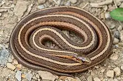 Thamnophis brachystoma is a small species of snake, with a total length (including tail) of 254–559 mm (10.0–22.0 in).[4] There is no apparent distinction between the body and head.[4] Unlike Thamnophis sirtalis, there are no black spots between stripes in T. brachystoma.[4] Dorsal coloration tends to be olive or olive-green with three (1 dorsal, 2 lateral) beige to yellow stripes running the length of the body.[5] There is a distinct sexual dimorphism in this species with females being larger than males.[5]