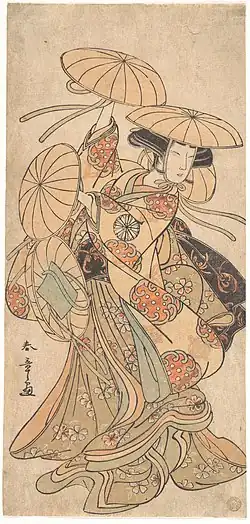 The first actor to perfect the genre was Segawa Kikunojo I (c. 1693–1749),[7] considered an excellent dancer and the best onnagata in Edo during the first half of the 18th century.[10] He became very successful shortly after arriving to the city in 1730 by performing the leading role on the dance Aioi Jishi at the Nakamura-za.[11] He specialized in the performance of Shakkyomono (such as Aioi jishi) and Dojojimono dances.[12] Some other important dance roles he performed in those early years were Sayo no Nakayama Asama-ga-Dake (1736), Mugen no Kane (1739), Hanabusa Shishi no Rangyoku and Makura Jishi (1742), and Mugen no Kane Omoi no Akatsuki (1746).[10]