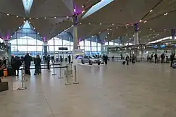 Construction of Terminal 1 was delayed several times but finally began in 2010. In November 2013, the airport was tested for errors by over 5,200 residents of Saint Petersburg who partook in the process. Several days after the test, the new Terminal 1 opened on December 3, 2013. On February 14, 2014, all operations were consolidated into the new terminal as the old Pulkovo 1 and Pulkovo 2 terminals have been shut down.[18] The new terminal contains several business lounges, restaurants, pharmacies. Terminal 1 is 147,000 m2 (1,580,000 sq ft) and has 400,000 m2 (4,310,000 sq ft) airport dock in front of it. The airport has 88 check-in counters, 110 passport booths, 7 baggage carousels, 110 parking stands, 17 gates, and 17 escalators. The interior of the new airport was designed by Grimshaw Architects and directly correlates with the designs and style of Saint Petersburg city. The new Terminal also sought many artistic sculptures and paintings to give http://line-stargadget.ru/ Archived 2022-08-09 at the Wayback Machine a sense of thriving culture to passengers. Four sculptures from Dmitry Shorin's project named I Believe in Angels decorate the departure hall.[20][21]