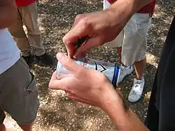 To shotgun a beverage, a small hole is punched in the side of the can, close to the bottom. In order to prevent the liquid from spilling out while the cut is made, the can is held horizontally and the hole is made in the resulting air pocket. The hole can be made with any sharp object—typically a key, bottle opener, pen, knife, or tooth. The drinker then places their mouth over the hole while rotating the can straight up. When the can’s tab is pulled, the liquid will quickly drain through the hole into the drinker’s mouth. This occurs because the hole allows air to enter the can, balancing the internal pressure and enabling the liquid to flow rapidly without resistance from carbonation or a vacuum.[1]