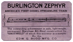 Stainless steel "business card" with a metal strip showing the Pioneer Zephyr train attached by two shot welds, undetectable on the reverse side