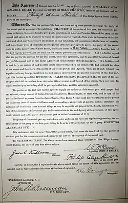 Show Indians, or Wild West Show Indians, is a term for Native American performers hired by Wild West shows, most notably in Buffalo Bill's Wild West and Congress of Rough Riders. "Show Indians" were primarily Oglala Lakota from the Pine Ridge Indian Reservation, South Dakota. Performers took part in reenacting historic battles, demonstrating equestrianism and performing dances for audiences. Many veterans from the Great Plains Wars participated in Wild West shows,[1] during a time when the Office of Indian Affairs was intent on promoting Native assimilation. Many went on to act in silent films.