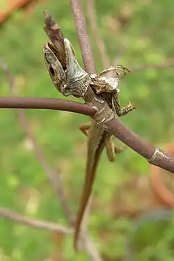 Male shrikes are known for their habit of catching insects and small vertebrates and impaling them on thorns, branches, the spikes on barbed-wire fences, or any available sharp point. These stores serve as a cache so that the shrike can return to the uneaten portions at a later time.[8] The primary function of conspicuously impaling prey on thorny vegetation is however thought to be for males to display their fitness and the quality of the territory held to prospective mates.[9] The impaling behaviour increases during the onset of the breeding season.[10] Female shrikes have been known to impale prey, but primarily to assist in dismembering prey.[11] This behaviour may also serve secondarily as an adaptation to eating the toxic lubber grasshopper, Romalea microptera. The bird waits 1–2 days for the toxins within the grasshopper to degrade before eating it.[12]