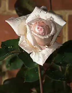 Gardeners most value roses for their large and brightly coloured flowers, which exist in every colour in the white to yellow to red part of the colour spectrum. A truly blue rose has yet to be bred, but there are a number of shades of purple.[4] There are single or double-flowered varieties, with the latter much more popular. The petals are typically of a single colour, although bi-colour, striped and blended varieties exist. The classic hybrid tea rose flower shape, pointing up, tightly curled in the centre, with the outer petals spreading wide, is the most popular for gardens, and even more dominant in florists. But there are many alternatives. Most of the wild parent species are single-flowered with flat blooms, flowering only once, and many are still grown in gardens.[5] Most varieties produce a single flower on a stem, but floribunda roses, introduced in the early 20th century, have a spray of several flowers, and are highly popular; they also have more continuous flowering.[6] Most garden varieties still have thorns, though fewer than those in wild species, but some are thornless. It is often complained that modern varieties are deficient in scent from the flowers, and many are.[7] An important development in recent decades has been extending the flowering season, in some cases to eight months in the right conditions, though the flower display still tends to be best in one or two "flushes", the first in late spring.