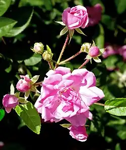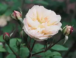 Although they arose too late to qualify technically as old garden roses, the hybrid musks are often informally classed with them, since their growth habits and care are much more like the old garden roses than modern roses. The hybrid musk group was mainly developed by Rev. Joseph Pemberton, a British rosarian, in the first decades of the 20th century, based upon 'Aglaia', an 1896 cross by Peter Lambert. A seedling of this rose, 'Trier', is considered to the foundation of the class.[14] The genetics of the class are somewhat obscure, as some of the parents are unknown. Rosa multiflora, however, is known to be one parent, and Rosa moschata (the musk rose) also figures in its heritage, though it is considered to be less important than the name would suggest. Hybrid musks are disease-resistant, repeat flowering and generally cluster-flowered, with a strong, characteristic "musk" scent.[34] The stems tend to be lax and arching, with limited thorns.[22] Examples include 'Buff Beauty' and 'Penelope'.