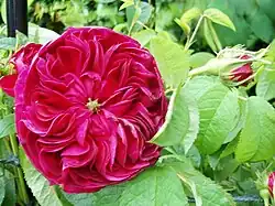 The Gallica, Gallica Hybrid, or Rose of Provins group is a very old class developed from Rosa gallica, which is a native of central and southern Europe and western Asia.[14] The "Apothecary's Rose", R. gallica varietas officinalis, was grown in the Middle Ages in monastic herbaria for its alleged medicinal properties, and became famous in English history as the Red Rose of Lancaster. Gallicas are shrubs that rarely grow over 4 feet (1.25 m) tall and flower once in Summer. Unlike most other once-blooming Old Garden Roses, gallicas include cultivars with flowers in hues of red, maroon, and purplish crimson. Examples include 'Cardinal de Richelieu', 'Charles de Mills', and 'Rosa Mundi' (R. gallica varietas versicolor).
