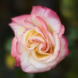 Rose flowers have historically been cultivated in a diverse number of colours ranging in intensity and hue; they are also available in countless combinations of colours which result in multicoloured flowers. Breeders have been able to widen this range through all the options available with the range of pigments in the species. This gives us yellow, orange, pink, red, white and many combinations of these colours. However, they lack the blue pigment that would give a true purple or blue colour and until the 21st century all true blue flowers were created using some form of dye. Now, through genetic modification, a Japanese company succeeded in creating a blue rose in 2004.[21] Colours are bred through plant breeding programs which have existed for a long time. Roses are often bred for new and intriguing colour combinations which can fetch premium prices in market.