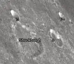 By convention these features are identified on lunar maps by placing the letter on the point of the crater rim that is closest to Shuckburgh.