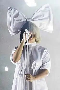 For performances of songs from 1000 Forms of Fear, Sia chose not to show her face, either facing away from audiences or hiding it behind oversized platinum blonde wigs. In videos for the singles "Chandelier", "Elastic Heart" and "Big Girls Cry", choreographed by Ryan Heffington and co-directed by Sia and Daniel Askill, and in many of the promotional live performances, child dancer Maddie Ziegler performed as a proxy for Sia in bobbed blonde wigs similar to Sia's familiar hairstyle.[67][68][69][70] The three videos have received a total of more than 4 billion views on Vevo.[71] In an interview with Kristen Wiig in Interview magazine, she said she decided to conceal her face to avoid a celebrity lifestyle and maintain some privacy: "I'm trying to have some control over my image. And I'm allowed to maintain some modicum of privacy. But also I would like not to be picked apart or for people to observe when I put on ten pounds or take off ten pounds or I have a hair extension out of place or my fake tan is botched. Most people don't have to be under that pressure, and I'd like to be one of them."[72] The video for Elastic Heart "courted controversy and plaudits in equal measure", with some commentators perceiving it to have paedophilic undertones due to the relative ages of the dancers.[73][74] Sia explained that the two dancers represented "warring 'Sia' self states", but she nevertheless apologised on Twitter to anyone who was "triggered".[75][76] Gia Kourlas wrote in The New York Times in 2016 that Sia's collaborations with Heffington have "done more to raise the standards of dance in pop music than nearly any current artist integrating the forms".[77] The "Chandelier" video was ranked as the 10th "greatest music video" of the 2010s by Billboard.[78]