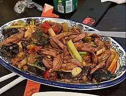 | Shredded pork in yuxiang sauce | ![]() | 魚香肉絲 | 鱼香肉丝 | yúxiāng ròusī | Literally "sliced pork with fish aroma" |