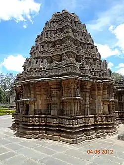 The temple may have been consecrated initially as a Vaishnava temple (to the God Vishnu), later taken over by Jains who may have removed some images from the temple and eventually became a Shaiva temple after coming under the procession of the worshippers of God Shiva.[6] This conclusion is drawn because the image of the Sun God Surya exists below the little Kirtimukhas (gargoyle faces) on the temple's eastern wall (back wall). However, a picture of Shiva, sculpted out of an independent slab of stone and mounted in front of the Shikhara (superstructure) above the mantapa roof, would suggest otherwise.[3] Overall, the temple plan bears all the hallmarks of a standard 11th-century Chalukyan construction with Dravida architectural articulation to which some innovative 12th-century elements, such as aedicules, and miniature decorative towers on pilasters, were added.[7]