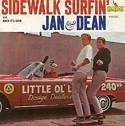 "Sidewalk Surfin'" is a song with music by Brian Wilson and lyrics by Roger Christian, which was recorded by 1960s American pop singers Jan and Dean. The song was recorded as a single and then appeared on the 1964 album Ride the Wild Surf, and later on the Little Old Lady from Pasadena album. The B-side of the single is "When It's Over."[1] "Sidewalk Surfin'" reached number 25 on the Billboard Hot 100 on October 31, 1964, which was Jan and Dean's lowest-charting single in a year and a half since the release of their number one hit single "Surf City."[2][3] Jan and Dean were known for their music of the 1960s surf era with songs like "Dead Man's Curve," "Drag City," and "The Little Old Lady from Pasadena."